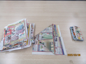 | 5日 施設の途中で信号停止時車内より撮影 | 施設に咲いていたおかめ桜? | 作業の合間に作るゴミ入れです。チラシを織ります |